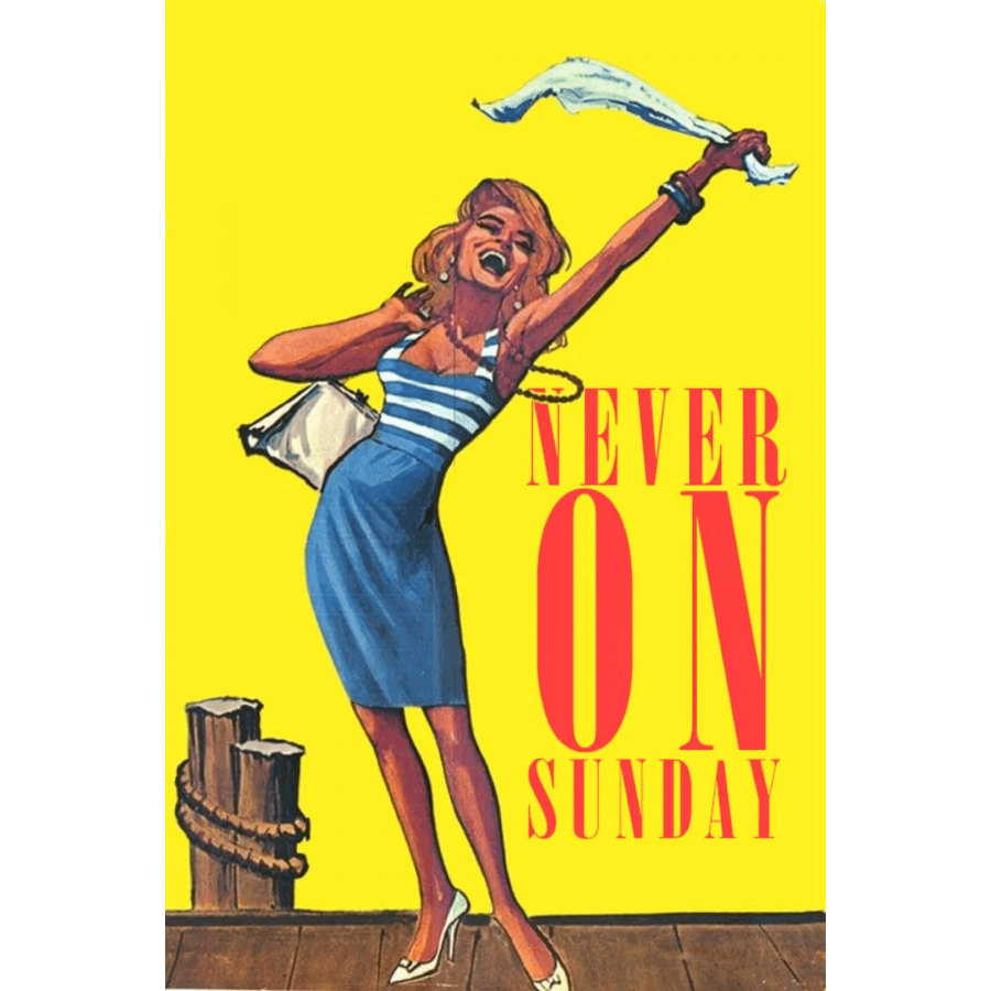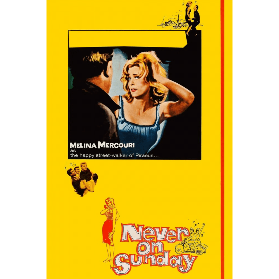 Etiquetas: Pote tin Kyriaki, Nunca aos Domingos, Jules Dassin, 1960, prostituta, cidade portuária, romance, história de amor, americano na Grécia, cultura grega, mitologia grega, cenário Pigmalião, filósofo, intelectual, estudioso, rivalidade amorosa, sedução, relação mentor masculino e protegida feminina, opostos se atraem, comédia de costumes, choque cultural, transformação, ciúme, engano, bebida, vida noturna, trabalhador do porto, bouzouki, dança grega, dança folclórica, música pop, praia, natação, festa de aniversário, flerte, prostituição, trabalhadora sexual, apaixonar-se, aventura, felicidade, estilo de vida, vida despreocupada, romance greco-italiano, vida social, reflexão filosófica